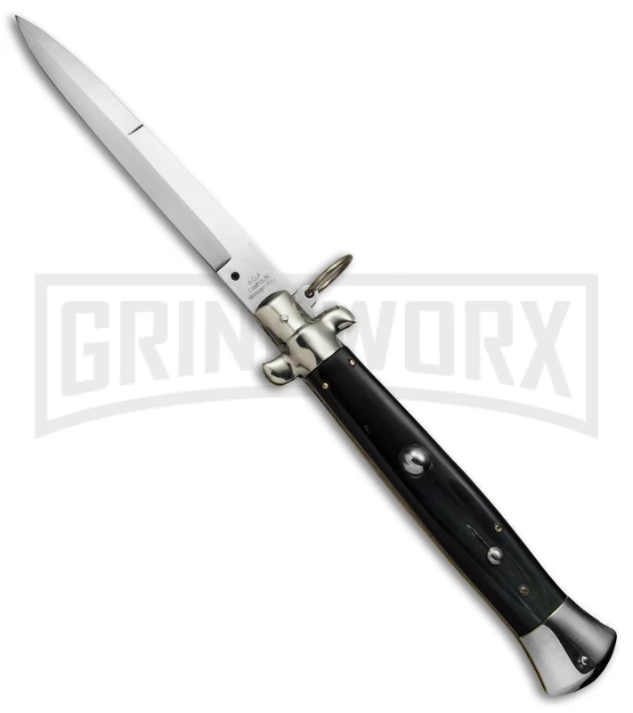 A.G.A. Campolin 15″ Italian Stiletto Dark Horn Ring Pull Automatic Knife – Bayo