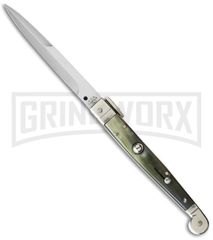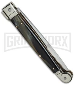 This A.G.A. Campolin Sicilian Pick Lock knife features a collectible, Italian made design. It has a stainless steel bayonet blade with a polished finish and is marked on the tang “A.G.A. CAMPOLIN ITALY”. The bolstered handle has brass liners, Brazilian horn scales, a sliding safety and pick lock release. This Sicilian automatic knife from A.G.A. Campolin will make an impressive addition to any collection!