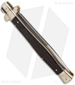 This excellent collectors piece is a stunning stiletto from AGA Campolin and is certain to become one of your favorites. The bayonet blade has a high polish finish and is stamped with “AGA Campolin Italy – 2014” on the blade tang. The bolsters and buttons are polished nickel silver, while the liners and pins are polished brass, lending a rich tone to this elegant knife. The push button release tends to be more firm on these blades, but the action is smooth and the lock up is secure. There is a sliding safety to protect against the accidental opening of the knife. The ebony wood handle scales give this knife a rich, earthy. To close the blade, pry back the Frosolone pick-lock at the base of the blade spine. Includes a soft leather storage pouch.