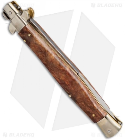 This is a gorgeous piece from AGA Campolin andis certain to become one of your collection favorites. The bayonet blade has a high polish finish and is stamped with “AGA Campolin Italy – 2014” on the blade tang. The bolsters and buttons are polished nickel silver, while the liners and pins are polished brass, lending a rich tone to this elegant knife. The push button release tends to be more firm on these blades, but the action is smooth and the lock up is secure. There is a sliding safety to protect against the accidental opening of the knife. The burl wood handle scales give this knife a rich, earthy detail that is unique among these knives. To close the blade, pry back the Frosolone pick-lock at the base of the blade spine. Includes a soft leather storage pouch.