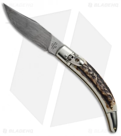 This Italian Stiletto from A.G.A. Campolin comes in the Diana Leverlock style with a stag horn handle and a Damascus steel blade. A.G.A. Campolin offers some of the finest traditional Italian Stiletto’s on the market, with a variety of collectible styles to choose from. This Diana model has a stag horn handle with nickel silver bolsters and lever. Brass pins and liners add a classic touch to the design. The blade comes in a clip point style with a plain edge and a polished finish. Add a piece of Italian history to your collection with the A.G.A. Campolin Diana Leverlock Stiletto.